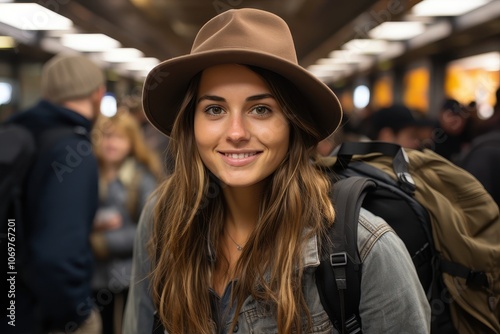 A young woman at a train station is happy and relaxed