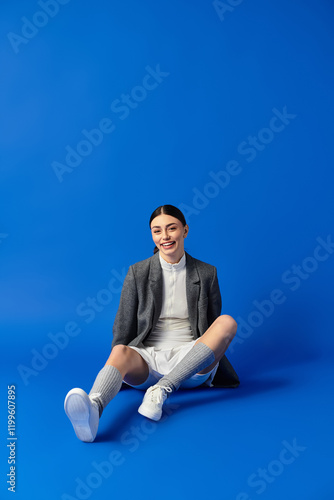 A young woman beams with happiness, sitting on a smooth blue surface in stylish comfort.