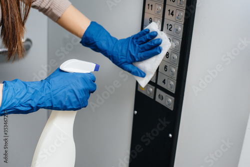 A young woman disinfects and cleans keys in an Elevator during a global pandemic. Stay at home
