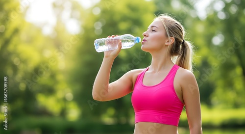 A young woman drinks water with a bottle of water in her mouth against a bright natural background. Health care concept.