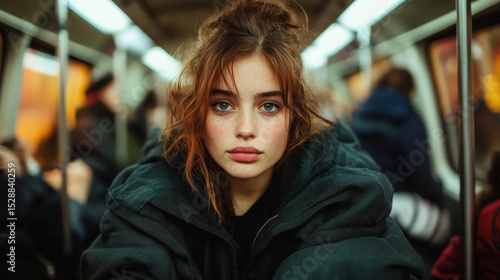 A young woman gazes thoughtfully on public transport, reflecting the emotions of solitude and contemplation amidst the hustle of city life.