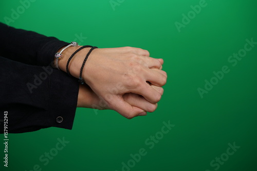 A young woman hands in a studio with a green background, showing natural emotions, Unedited image