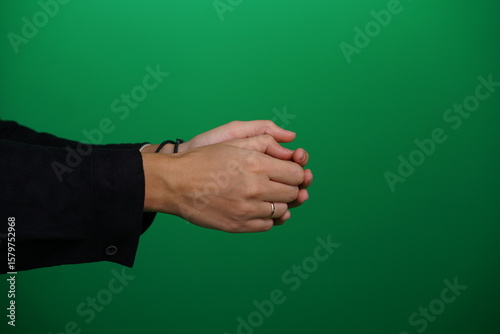 A young woman hands in a studio with a green background, showing natural emotions, Unedited image