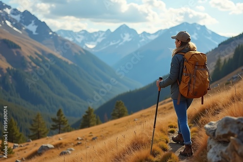 A young woman hiking in a scenic mountain landscape with vibrant colors, ideal for outdoor or adventure ads
