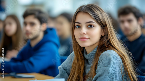 A young woman in a classroom setting, engaged in learning.