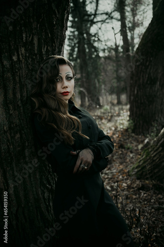 A young woman in a Gothic gloomy image of a witch in a forest surrounded by smoke. Halloween costume. Vertical photo.
