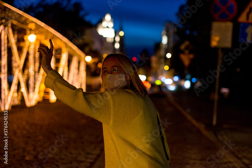 A young woman in a mask is catching a taxi. Woman in the city at night. Coronavirus concept. Woman wearing medical mask trying to catch a taxi in the city. Bokeh background. Health issues. Covid 19