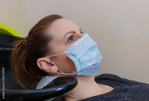 A young woman in a medical mask washes her hair in a barbershop during the covid-19 coronavirus pandemic