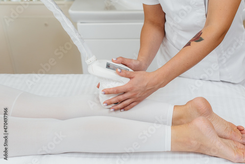 A young woman in a white suit, undergoing cosmetic LPG massage and laser lipolysis, close-up. Cosmetic procedure, in a medical center. Anti-cellulite procedures.