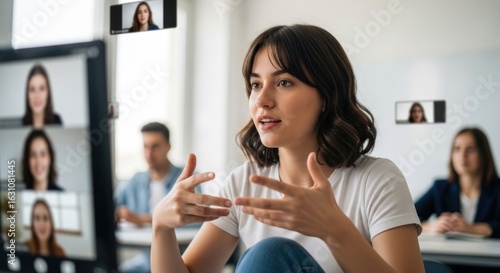 A young woman in a white t-shirt and jeans, engaged in a video call with a group of people.