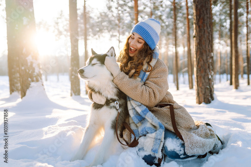 A young woman in warm clothes walking with her husky dog in a picturesque snowy outdoor. Playing with pets. Friendship concept.