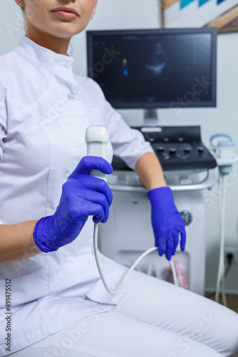 A young woman is an intern doctor, she is in a white suit and medical gloves holding an ultrasound probe on her hands. ultrasound diagnostics. selective focus