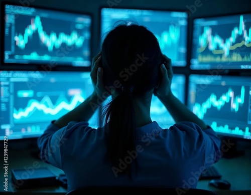 A young woman is sitting in front of computer screens displaying various data graphs and charts. She appears to be stressed, holding her head with her hands.