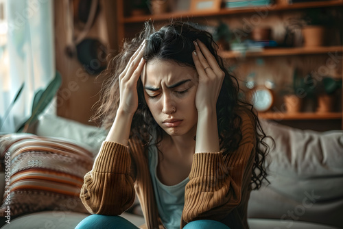 A young woman is sitting on a sofa in a living room and holding her head with both hands. Eyes closed in pain