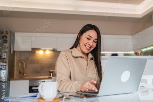 A young woman is working from her kitchen using laptop drinking coffee and using mobile phone