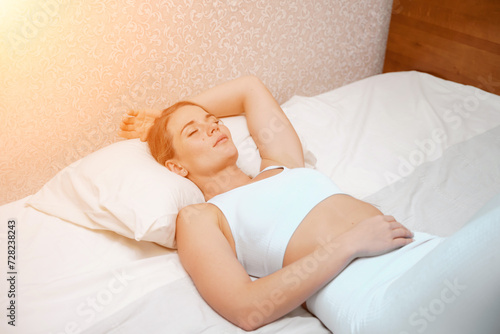 A young woman lies on a bed without a blanket. Bed linen is white.