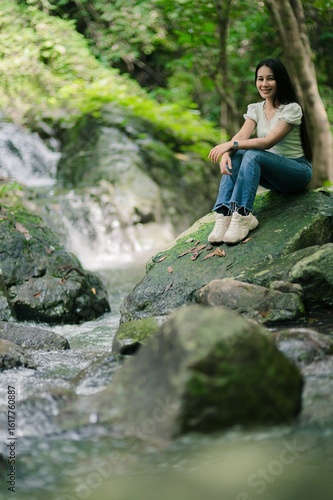 A Young Woman Relaxing by a Serene Waterfall in Lush Green Nature