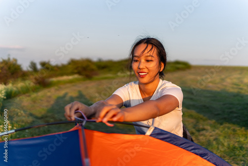 a young woman sets up a tent in a meadow after a hike, she is ready to rest