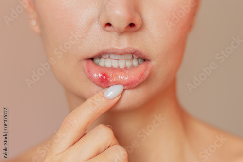 A young woman shows a close-up of a stomatitis ulcer in the acute stage on the mucous membrane of the mouth. Oral problems