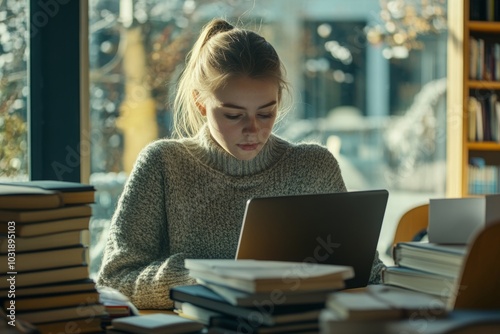 A young woman sits at a cozy library. She focuses on her laptop, surrounded by stacks of books. This scene captures the essence of study and concentration. Generative AI