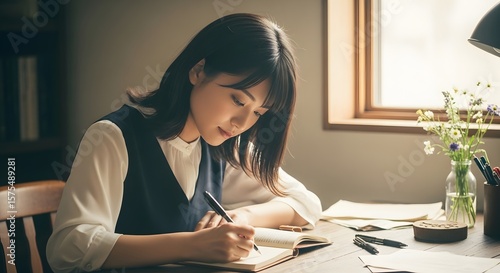 A young woman sits at a desk, focused on writing in a notebook with a pen.