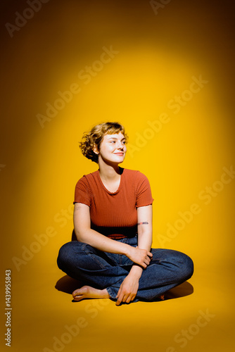 A young woman sits cross-legged, wearing a fitted rust-colored shirt and denim jeans.