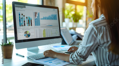 A young woman sitting at a desk, working on her finances, with details of the woman's focused expression, the computer screen, and the financial documents.