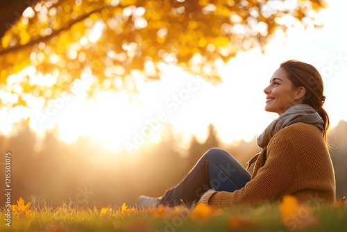 A young woman sitting on the grass under a golden autumn tree, enjoying a serene moment in nature, with bright sunlight illuminating her relaxed expression.