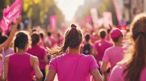 A young woman smiles as she runs in a pink race shirt, her hair flying behind her. She is determined to finish the race and is enjoying the challenge.
