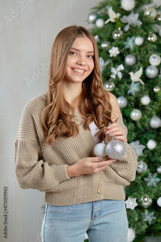 a young woman smiling stands at the Christmas tree with Christmas toys in her hands