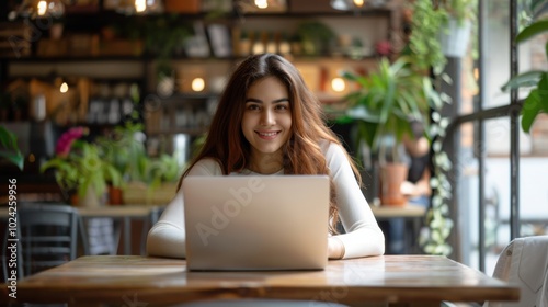 A young woman smiling while using her laptop in a well-lit cafe with plants, enjoying the cozy and green environment.