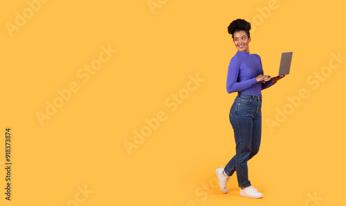 A young woman stands on her toes, smiling joyfully while holding a laptop in her hands against a bright yellow background, copy space