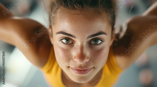 A young woman stretches in a gym, embodying focus and determination, her fitness routine enhanced by sleek, modern surroundings, encouraging strength and perseverance.