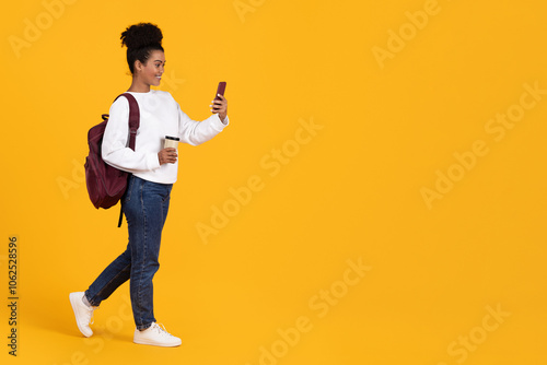 A young woman strolls confidently with a backpack, sipping coffee and checking her smartphone, surrounded by a vibrant yellow backdrop, highlighting a casual, modern lifestyle, copy space