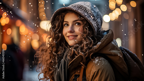 A young woman walks in the evening in the Christmas market, decorated with festive lights. winter holidays Design ai