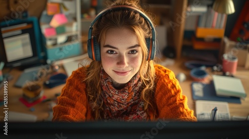 A young woman, wearing headphones and smiling, works at a table in front of a computer screen. Colorful desk accessories are in the background.