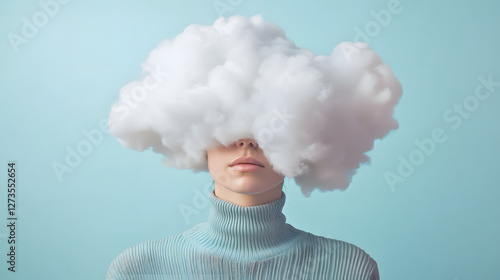 A young woman with a cloud-like hairstyle, isolated on a blue background