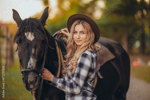 A young woman with a horse stands near a fence in autumn at sunset. Breeding thoroughbred horses for equestrian sport.