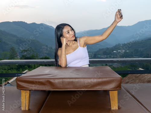 A young woman with a mobile phone takes a selfie on the porch at sunset over the valley
