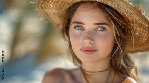A young woman with a straw hat at the beach, looking off into the distance with a dreamy expression, captured in soft lighting and natural setting, exuding a sense of peace.