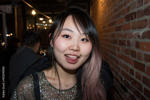 A young woman with a vibrant smile poses joyfully, showing off her stylish outfit in a warm and inviting setting