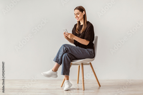 A young woman with brunette hair is sitting comfortably in an armchair while engaging with her smartphone. The isolated background highlights her relaxed and casual lifestyle.