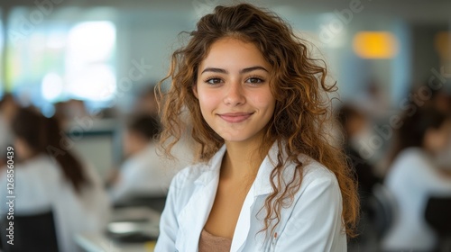 A young woman with curly hair, wearing a white lab coat, smiles confidently at the camera. Her warm gaze suggests a passion for her profession and a dedication to her field