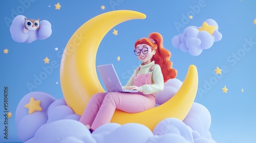 A young woman with curly red hair using a laptop while sitting on a crescent moon surrounded by fluffy clouds and stars at night