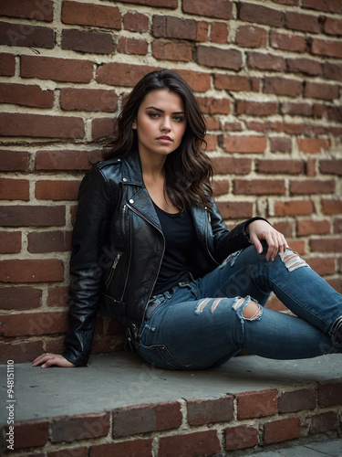 A young woman with dark, wavy hair wearing a leather jacket and ripped jeans, leaning against a brick wall.
