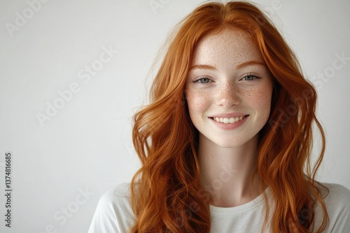 A young woman with freckles smiling at the camera. She has curly red hair and is wearing a casual top. The background is neutral, making her the central focus of the image.