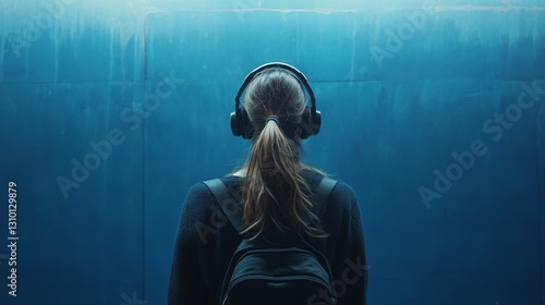 A young woman with headphones on is enjoying music while standing in front of a blue wall.