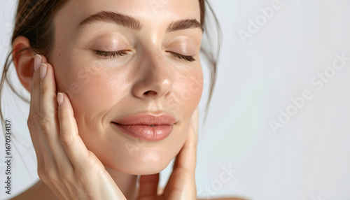 A young woman with healthy, glowing skin and closed eyes, gently touching her face, symbolizing beauty, skincare, and relaxation.