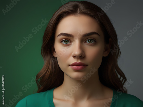 A young woman with long brown hair and green eyes poses against a green and gray background, wearing a green top and a calm expression.