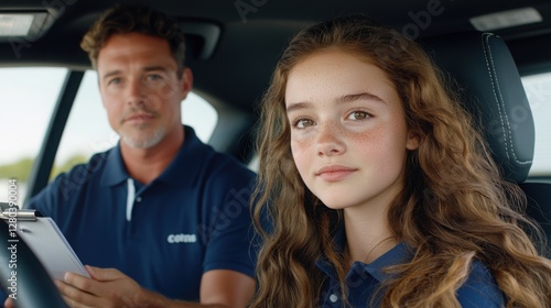 A young woman with long brown hair sits in the driver's seat of a modern car